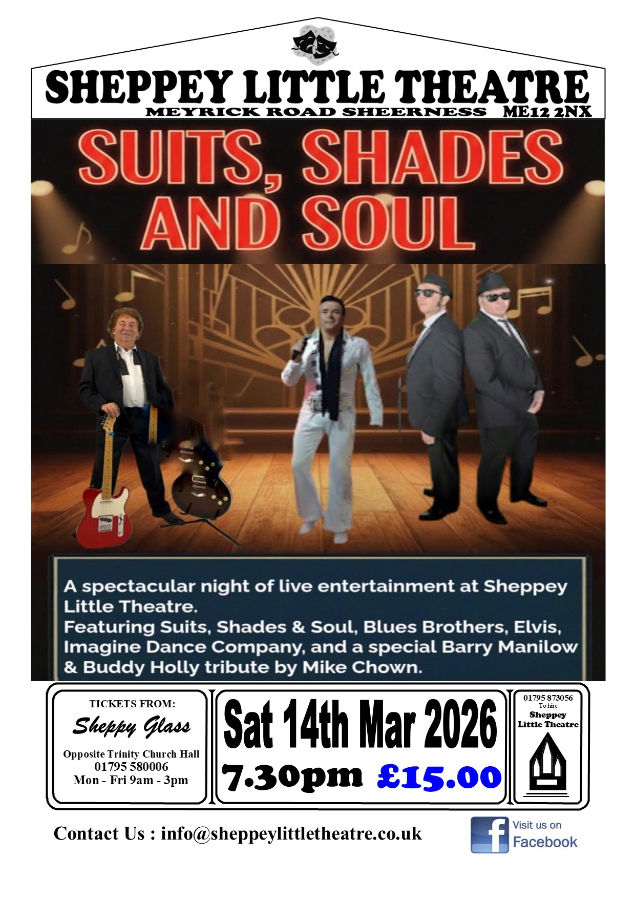 Tickets for most of our shows can be got from Sheppy Glass – telephone number 01795 580006 or in person from their shop at 24 Broadway, Sheerness, Kent, ME12 1AF during the below hours: